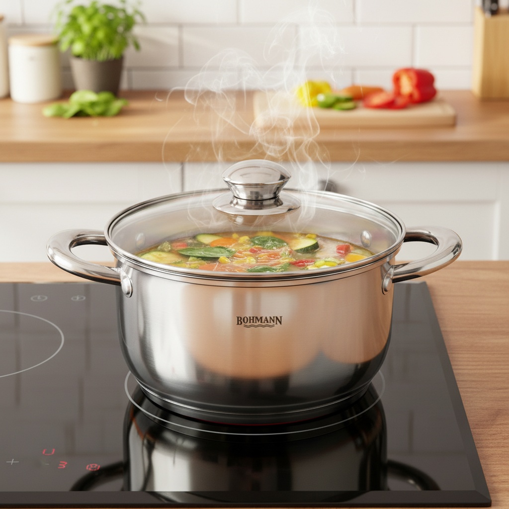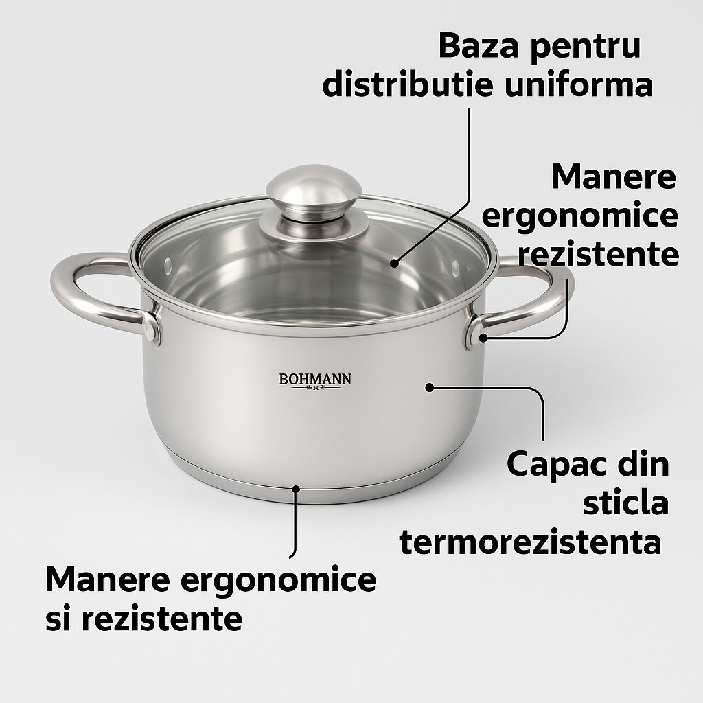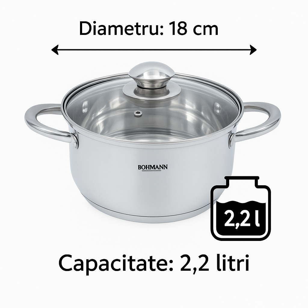 Cratita inox Bohmann BH-0805-18, 18 cm, 2.2 l, capac, inductie