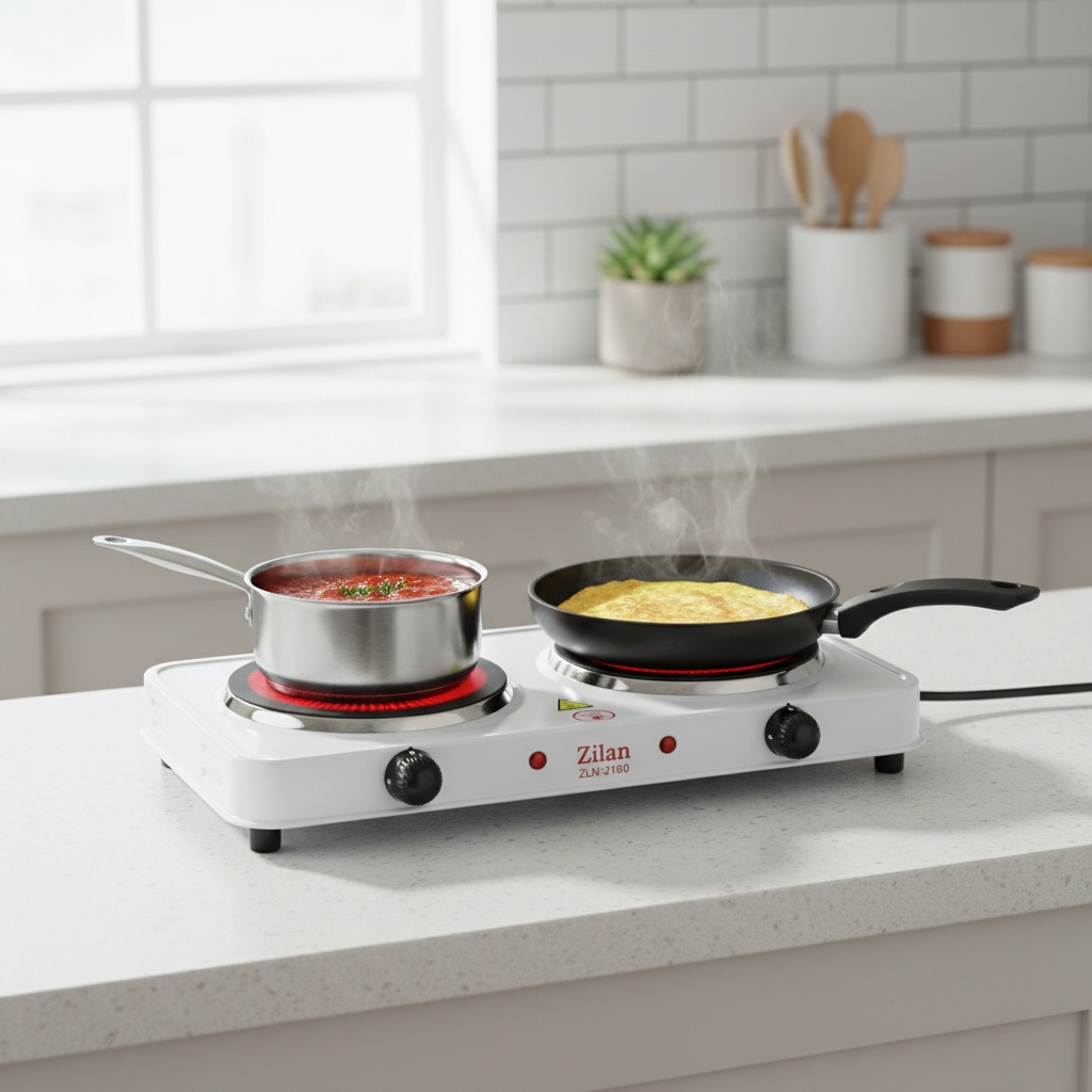Plita electrica dubla Zilan ZLN-2180, Alb, 2500 W, termostat reglabil, 49 x 30 x 9 cm. Are termostat pentru reglarea temperaturii si este ideala pentru gatit. Datorita dimensiunilor reduse aceasta plita electrica este potrivita pentru orice bucatarie si poate fi depozitata usor, ocupand foarte putin spatiu.