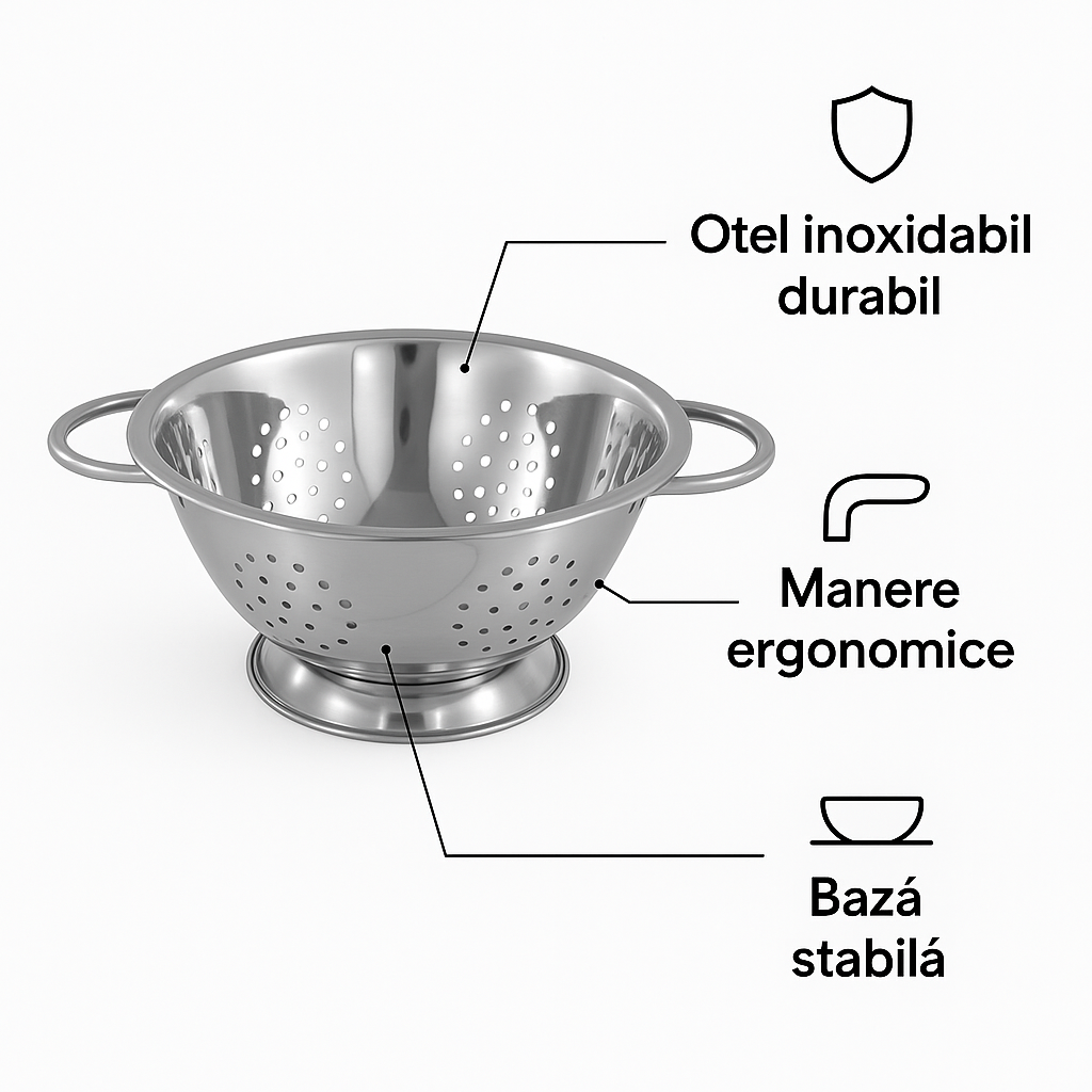 Strecuratoare inox Grunberg IDC20, 20 x 8 cm. Strecuratoare rotunda, fabricata din inox, cu manere.