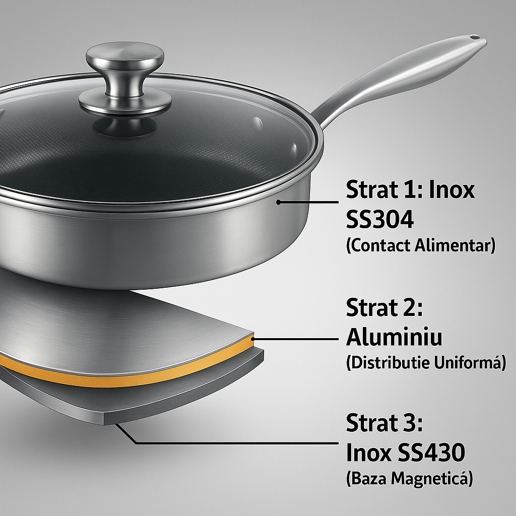 Tigaia este fabricata din inox cu invelis anti-aderent cu structura hexagonala tip honeycomb ( 3 straturi inox SS304 + aluminium + inox SS430),  cu maner din inox, nituit, rezistent la soc si temperaturi  inalte.