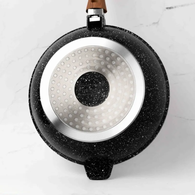 Acoperire ceramică marmorată: Suprafața interioară a oalei este acoperită cu un strat ceramic marmorat, oferind o rezistență crescută la lipire și facilitând gătitul fără grăsimi.